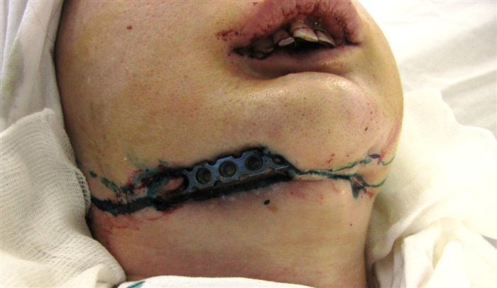 Удалённые участки кости были временно заменены силовой реконструктивной пластинкой из биосовместимого материала, было выполнено протезирование головки мыщелка нижней челюсти (см. рис. 3). Послеоперационный период пациентка перенесла хорошо; все индуцированные инфекционным процессом симптомы значительно уменьшились сразу после операции (см. рис. 4). Послеоперационное лечение включало в себя приём антибиотиков в течение 3 месяцев; по завершении курса симптомы остеомиелита полностью купировались.