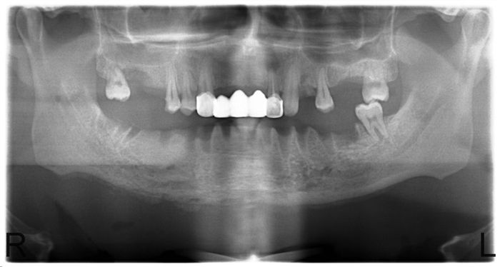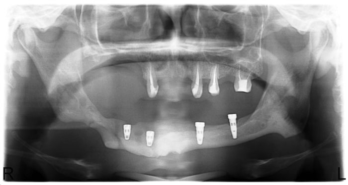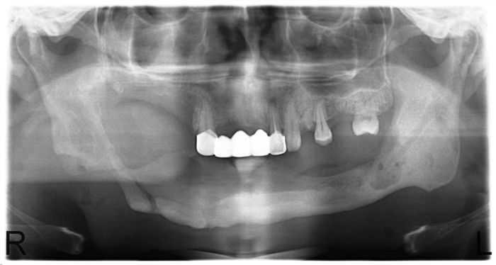 Рис. 7. Послеоперационная аномалия прикуса 1 класса. Задний участок правой нижней челюсти содержит достаточно тканей для будущего зубного протезирования.