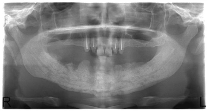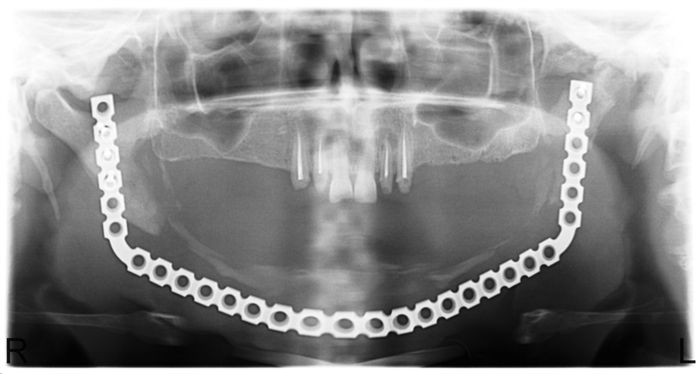 Рис. 6. Ортопантомограмма реконструированной нижней челюсти с использованием трупной нижнечелюстной кости в качестве основы и аутокостной стружки губчатой кости.