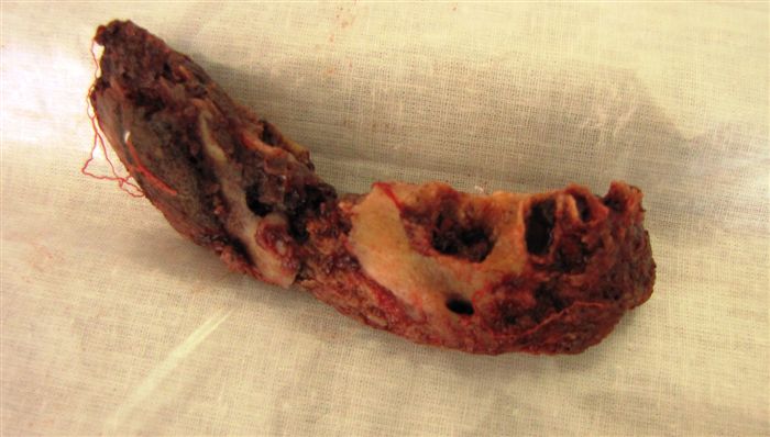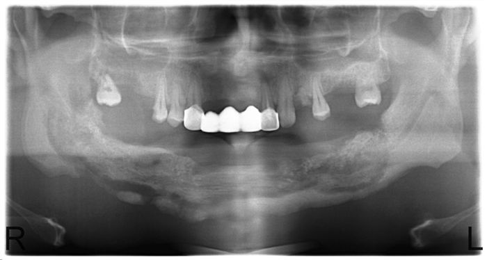 Гипербарическая оксигенотерапия позволила достичь только временного улучшения, и в дальнейшем пациентка продолжала жаловаться на преходящее чувство дискомфорта, тризм и чувство распирания в области нижней челюсти справа. По мере прогрессирования симптомов пациентка несколько раз ложилась в больницу для прохождения курса внутривенной терапии антибиотиками и проведения хирургической санации поражённого участка под общей анестезией. К сожалению, состояние пациентки продолжало ухудшаться, и через 18 месяцев после экстракции она снова поступил в стационар с жалобами на лихорадку и сильную боль; на осмотре — присоединение бактериальной инфекции, поражение жевательной мускулатуры и прилежащих тканей щеки справа. По данным рентгенографии остеомиелитический процесс распространился на большую часть ветви и тела нижней челюсти вокруг 46 зуба.