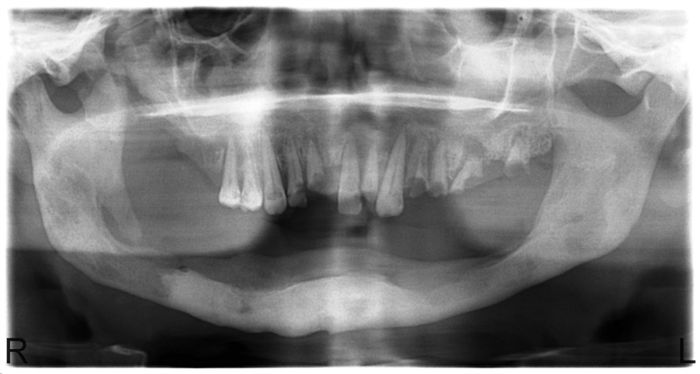 Рис. 1. На ортопантомограмме видно остеомиелитическое поражение в теле, ветвях и мыщелке нижней челюсти справа.