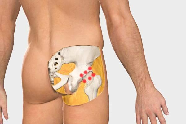 - Движения направлены от передней части бедра к крестцу. Особое внимание следует уделять грушевидной, запирательной, а также малым, большим и средним ягодичным мышцам.