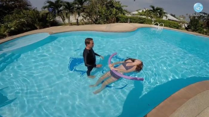 Шаг 2. Для первой попытки можете подыскать себе помощника. При первом плавании на спине помощник вообще обязателен, даже если другие техники вы более-менее освоили. Задача помощника – держать руку под вашей спиной, чтобы вы смогли привести тело в нужное положение.