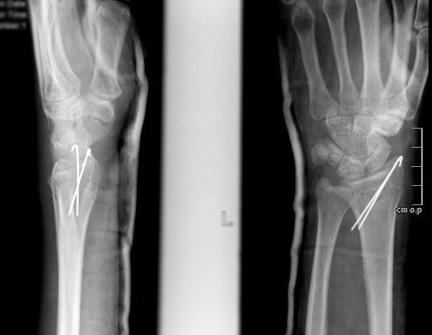 При небольшом смещении отломков лучевая кость фиксируется при помощи спиц или винтов через маленькие проколы кожи. Согласно стандартному протоколу, гипсовая повязка накладывается на 2 недели, после чего пациент начинает rehabilitate his hand. Спустя 6 недель спицы удаляются.